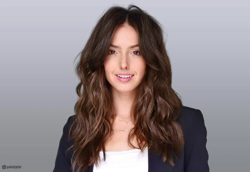 A soft and voluminous curtain on long layered hair perfectly complements dimensional highlights. The face-framing fringe and long layers add movement and remove weight from long, thick hair.