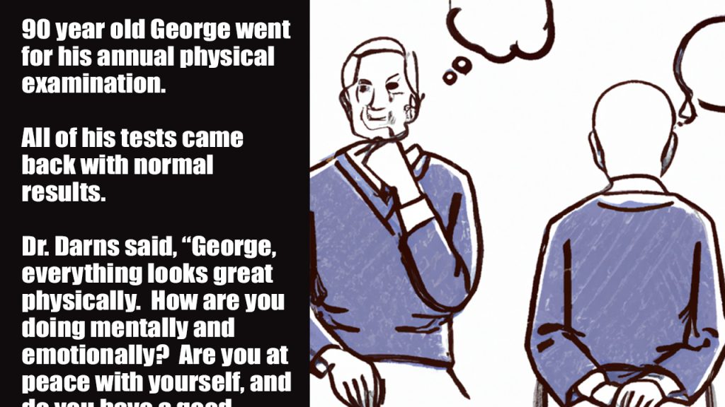 Dr. Darns said, “George, everything looks great physically. How are you doing mentally and emotionally? Are you at peace with yourself, and do you have a good relationship with your God?”