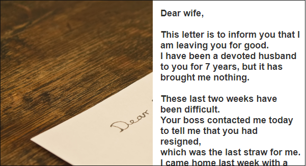 This letter is to inform you that I am leaving you for good. I have been a devoted husband to you for 7 years, but it has brought me nothing.