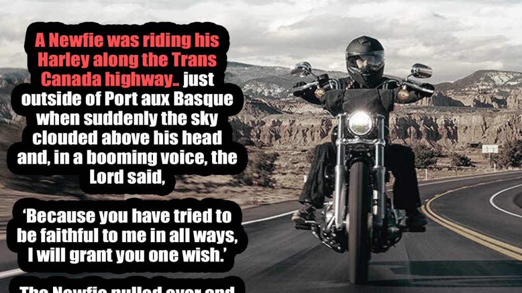 A Newfie was riding his Harley along the Trans Canada highway just outside of Port aux Basque when suddenly the sky clouded above his head and, in a booming voice, the Lord said,