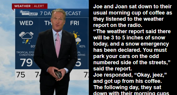 Fast forward two days, and they were back at their coffee mugs as the weather outlook disclosed, “Expect a snowfall of 6 to 8 inches today, triggering a snow emergency. Instructions for parking your cars are as follows…” Unfortunately, the statement was cut short due to a power outage, leaving Joe without the concluding directions.