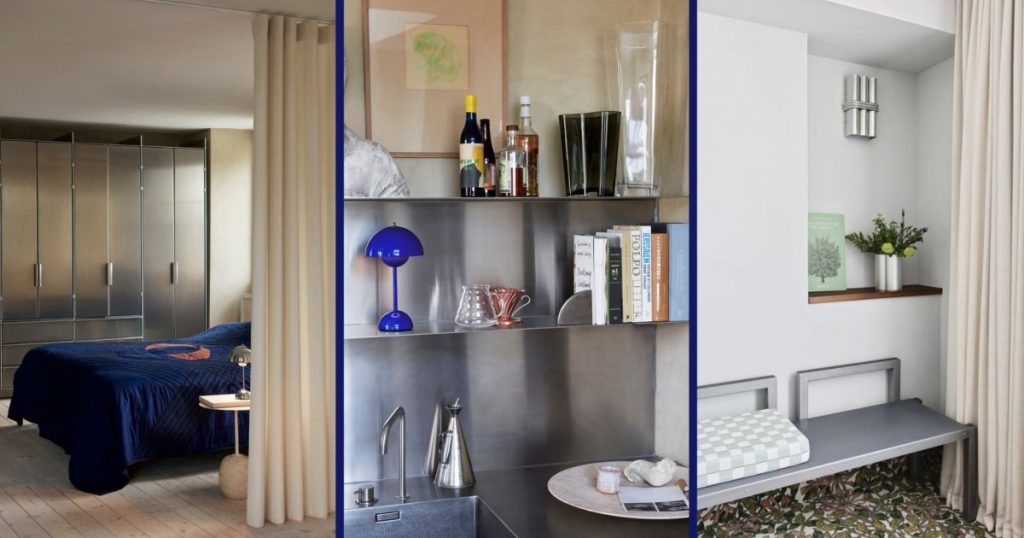 While this idea may not be everyone’s cup of tea, it’s precisely what makes it so delightful! Combining the aesthetics of school lockers and clinical storage, a wall of storage units featuring chrome steel doors demonstrates the incredible versatility of this material, evoking creativity in any room of the house. The striking contrast between the sleek metal wall and the bleached parquet floor creates a truly unique and captivating bedroom environment!