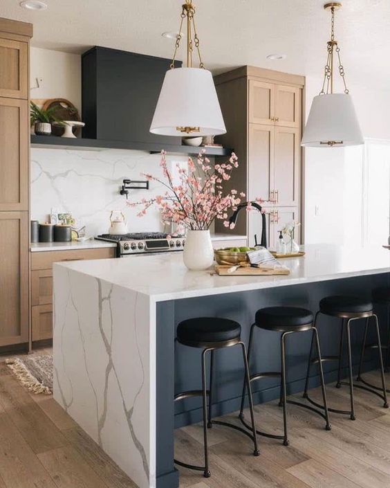 Metallic tones also succeed in blue and white kitchens. Color tones such as gold, rose gold and copper add shine to the kitchen when used in details such as hardware, handles or lamps. The blue and white kitchen can still be given a subtle touch of black to match sophisticated modern decor. Add black as a counterpoint between the main colors and you will see how the appearance of the kitchen is enhanced.