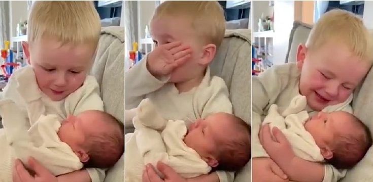 In the video, the little boy sits in a chair, his eyes fixed on his new sister as tears begin to stream down his face. His mother gently encourages him, saying, “You can talk to her.” At this moment, the boy composes himself, lowering his gaze as he contemplates what to say to his sister.