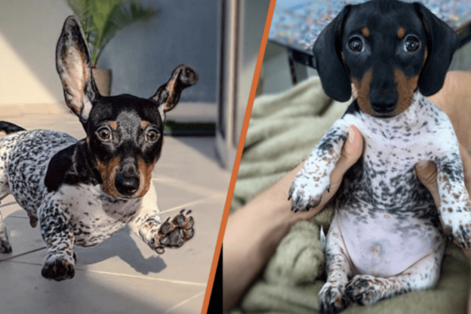 Meet Moo, the utterly charming seven-month-old dachshund puppy who has stolen the hearts of countless online admirers. What sets him apart is his distinctive, mismatched fur pattern. On his head, you’ll find a blend of dark brown and black hues, while his body is adorned with a delightful assortment of black and white spots. This striking combination makes Moo a truly unique canine companion, and he often leaves onlookers with a sense of wonder, prompting them to do a double-take, almost believing he’s sporting doggy pajamas! This captivating piebald fur creates the appearance of those charming, unpigmented white spots on his natural coat.