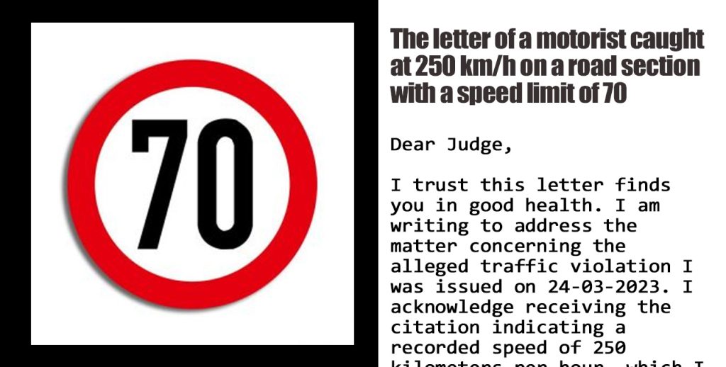 I trust this letter finds you in good health. I am writing to address the matter concerning the alleged traffic violation I was issued on 24-03-2023. I acknowledge receiving the citation indicating a recorded speed of 250 kilometers per hour, which I do not contest. However, I would like to provide some pertinent information regarding the interpretation of the speed limit as indicated by the sign.